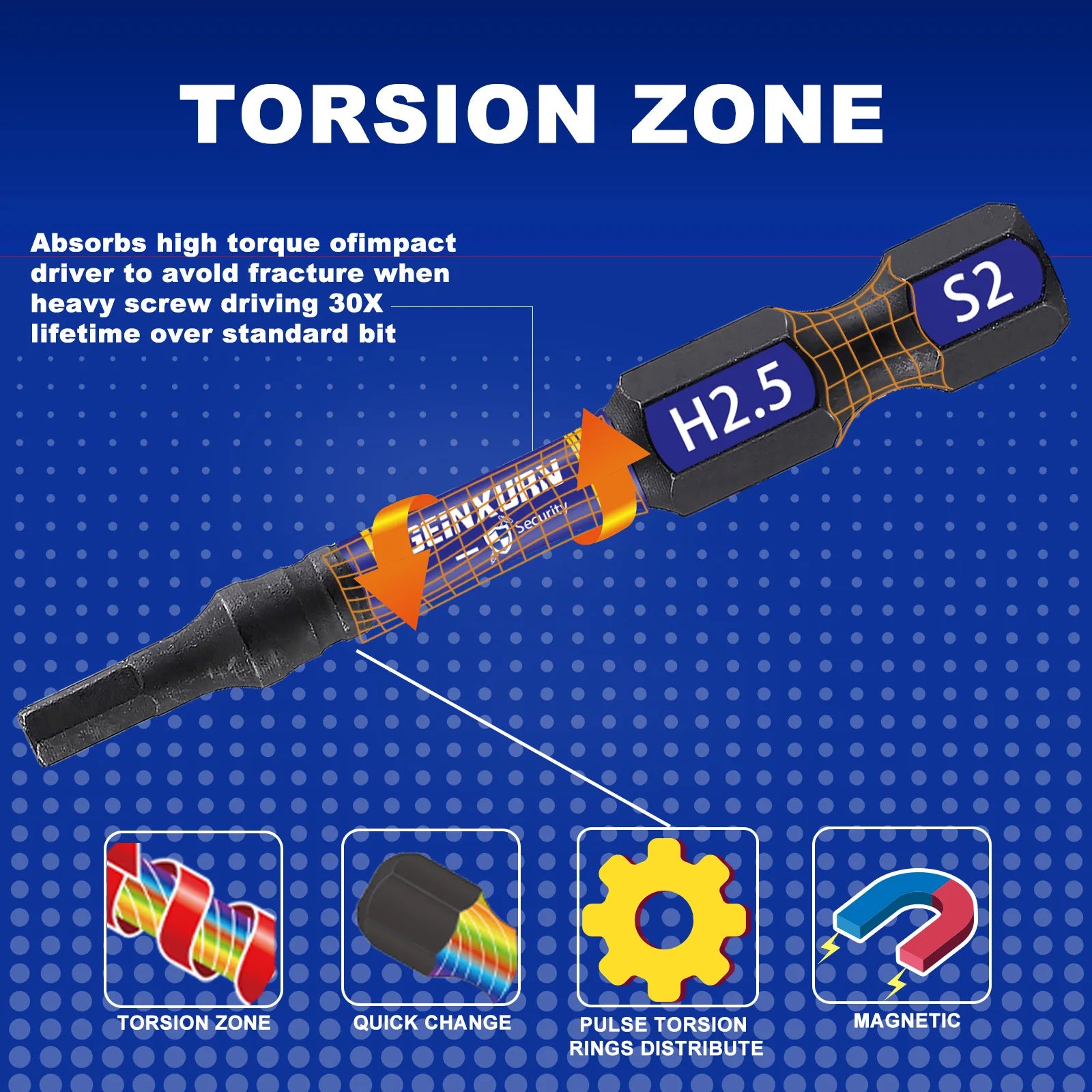 Upgrade your toolbox with this 1"/2" metric hex head impact bit set, engineered for high-torque applications and long-lasting performance. Crafted from S2 alloy steel and heat-treated for superior hardness and toughness, these bits feature a torsion zone to absorb torque peaks, magnetic tips to hold screws securely, and precision-machined ends for a snug, safe fit.