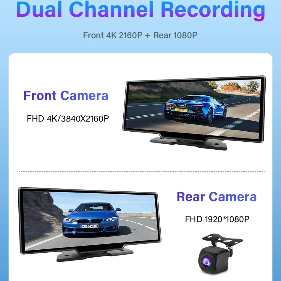 Transform your drive with a smart, streamlined solution that combines a high-resolution dash cam and a sleek rearview mirror display. Designed for busy commuters, ride-share drivers, and tech forward motorists, this unit records crystal-clear front 4K footage while offering a practical rear 1080P view to cover every angle. The integrated 10.26" IPS touchscreen keeps controls intuitive and clutter-free, while Wireless CarPlay and Android Auto bring navigation, calls, and music into your line of sight without distraction. Comfortable to use, elegantly designed, and robust enough for daily driving — it’s a genuinely useful upgrade you’ll notice from day one.