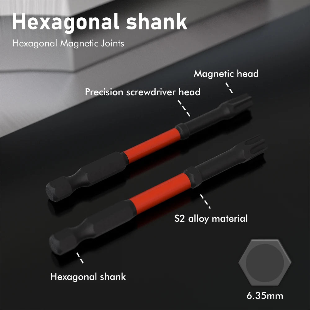 This 13-piece impact Torx and Allen wrench drill bit set is crafted from high-strength S2 alloy steel for maximum durability, toughness, and long-lasting performance. Each bit features a precision-machined tip for a secure fit, reducing cam-out and wear, and is magnetized to hold screws firmly in place. With a universal hex-shank design, these bits are compatible with impact drivers, electric drills, and manual drivers, making them ideal for furniture assembly, automotive repair, DIY projects, and general construction.
