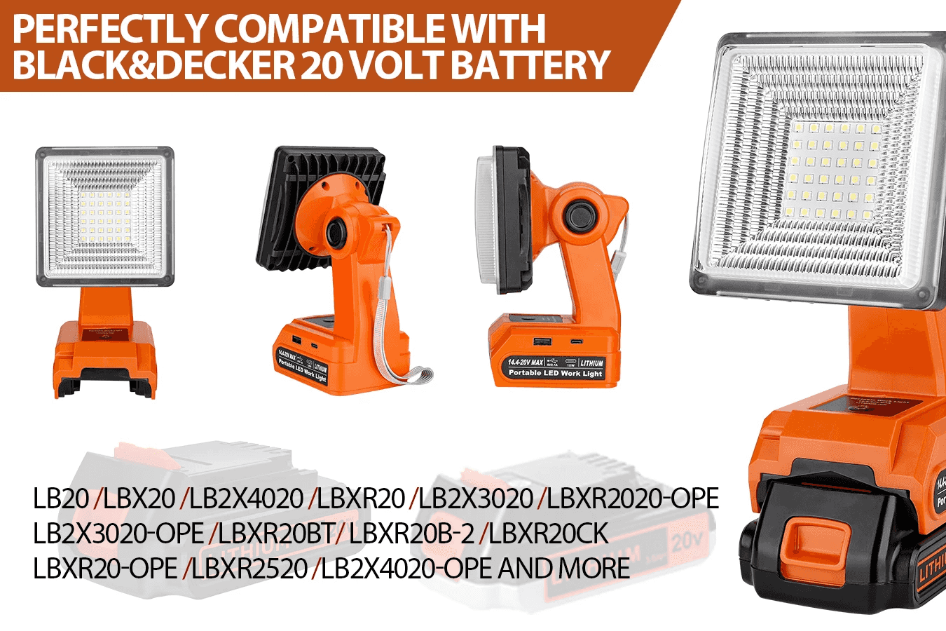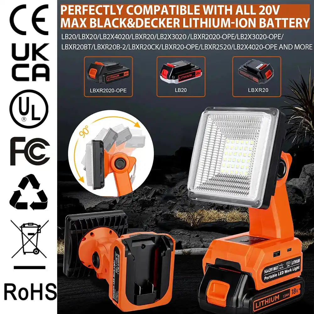 🔦 1500LM Cordless LED Work Light – Compatible with Black & Decker 14.4V–20V Batteries