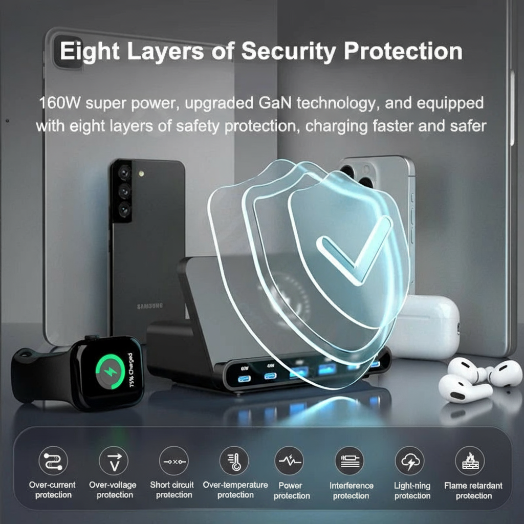Work smarter and charge faster with a compact power station that handles your laptop, tablet, phone and earbuds all at once — without the cable chaos. This 160W GaN desktop charging hub combines four USB-C ports, two USB-A ports and a 15W wireless pad, giving you powerful multi-device charging in a clean, minimalist setup.