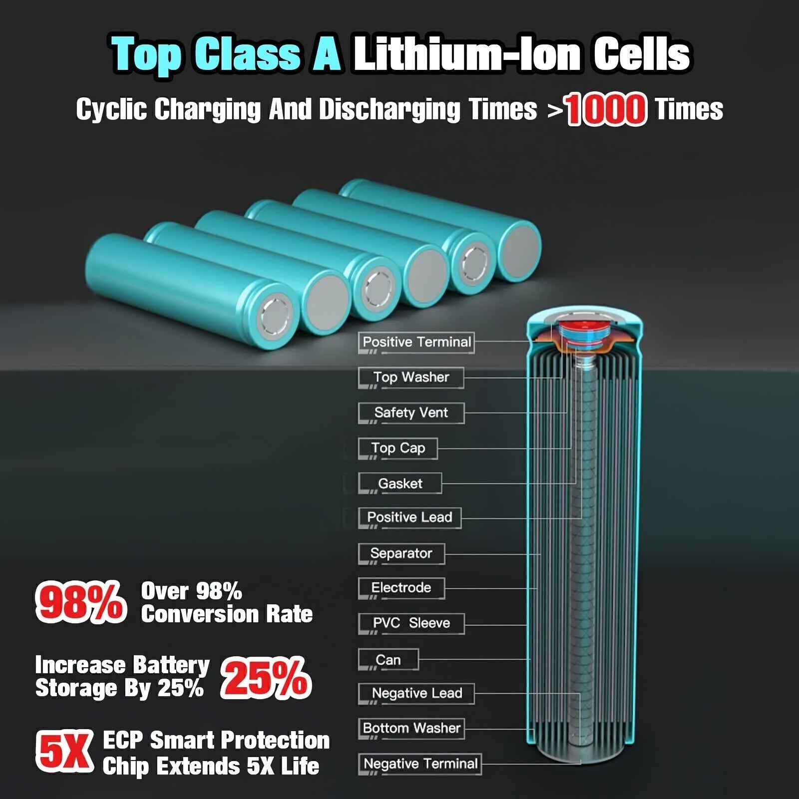 Featuring premium metal contacts, smart safety circuitry, and Class A lithium cells, each pack provides stable voltage output, optimal heat control, and protection from overload, short-circuit, and over-discharge events.