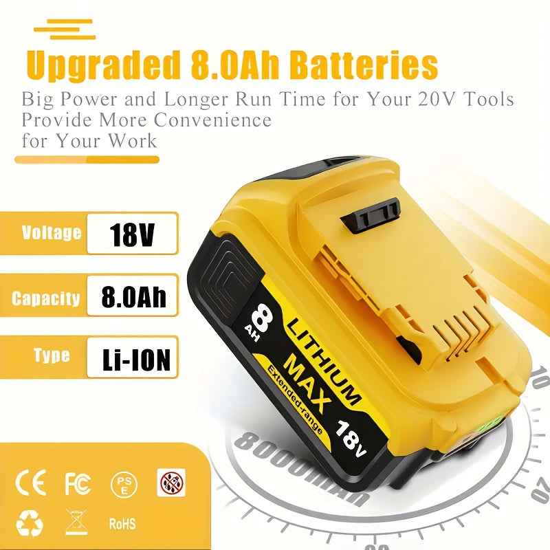 Get the endurance your tools deserve with this 2-pack of 18 V 8.0 Ah high-capacity lithium-ion batteries, designed as seamless replacements for Dewalt 18 V battery models DCB180 / DCB181 / DCB182 / DCB184 / DCB200 / DCB204.