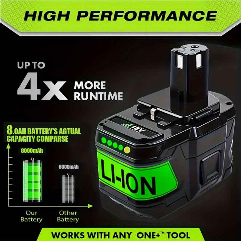 Give your Ryobi ONE+ tools a serious upgrade with this 2-Pack 18 V 8.0 Ah high-capacity Lithium-Ion battery set. Built for extended runtime, reliable current flow, and quick charging, it’s perfect for drills, saws, blowers, trimmers and more. Each pack delivers fade-free power and up to 4× longer operation than standard batteries — so you spend less time charging and more time getting the job done.
