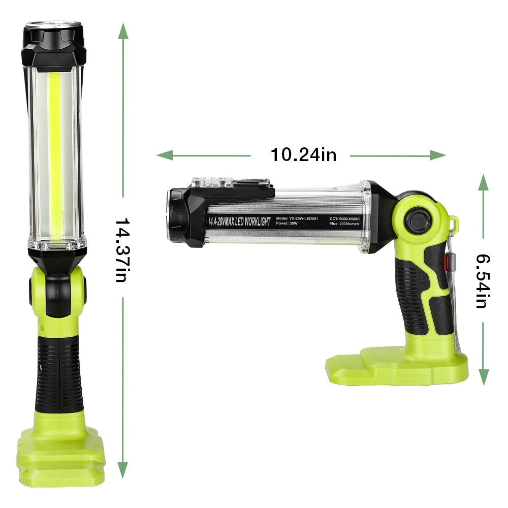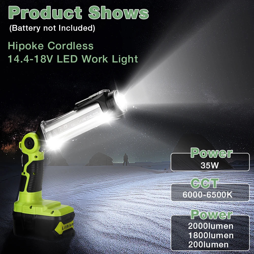 Illuminate any workspace with this powerful 2000LM LED work light, designed for versatility and reliability. With three lighting modes, a 90° pivoting head, and ergonomic design, it’s perfect for car repairs, camping, hiking, fishing, and emergency power outages. Compatible with popular Ryobi, Dewalt, Makita, and Milwaukee batteries (battery not included), it offers the flexibility to use your existing tools without extra investment.