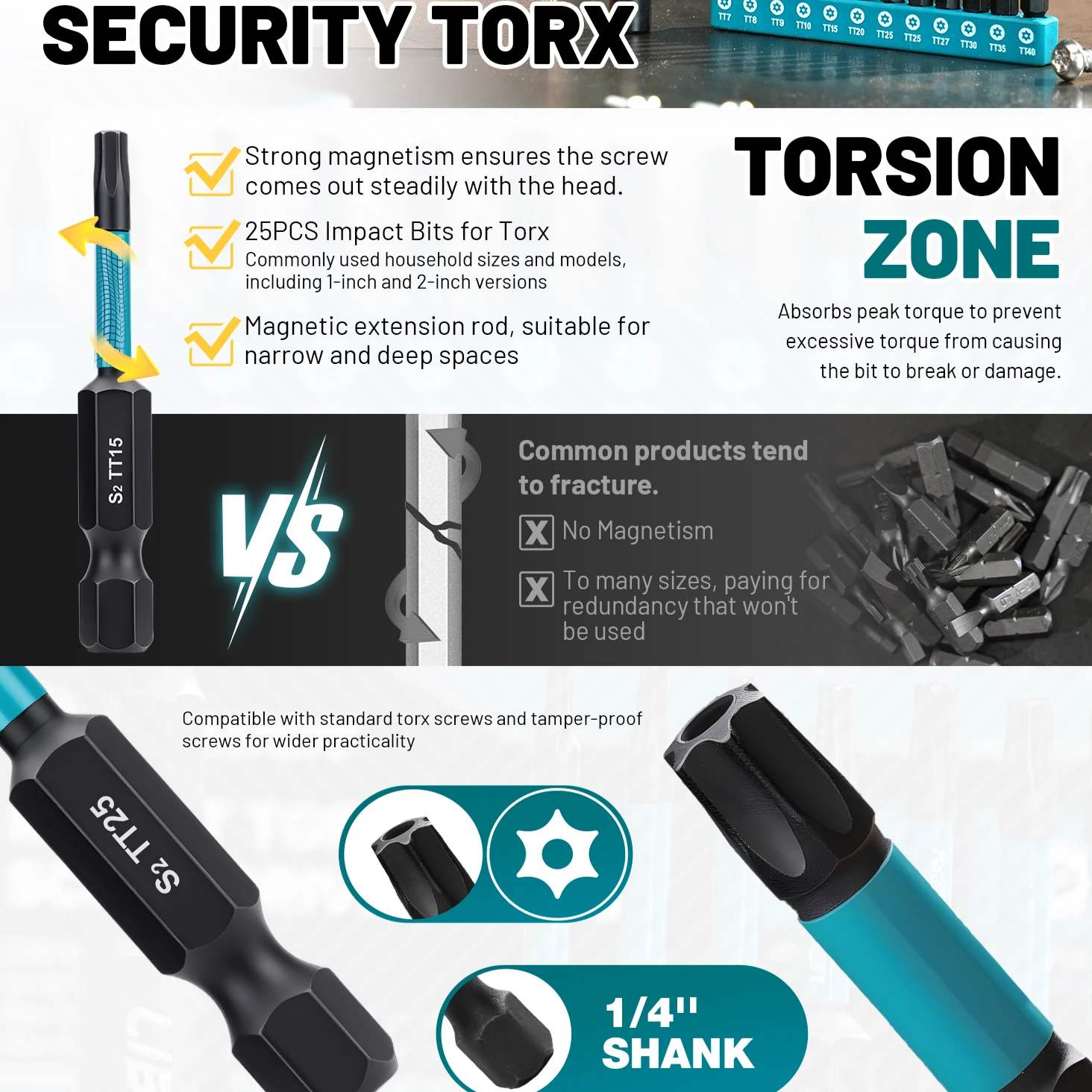 Upgrade your toolkit with this 25-piece tamper-proof Torx bit set, designed for precision, durability, and heavy-duty performance. Crafted from premium S2 steel, heat-treated for hardness and reinforced for high-torque applications, these bits are ideal for impact drivers, power tools, and demanding repair tasks.