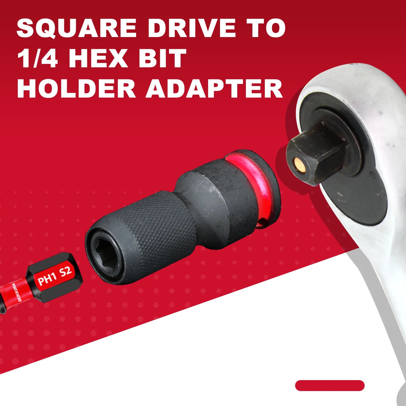 Upgrade your toolkit with this 3/8" square drive to 1/4" quick-release impact bit holder, designed for high-torque applications and precise screw driving. Crafted from chrome-vanadium steel and engineered with an extended torsion zone, this bit holder absorbs torque peaks from modern impact drivers, preventing wobbling, slipping, or breakage. The ball-stop groove ensures a secure fit for all compatible hex shank bits, making your work safer and more efficient.
