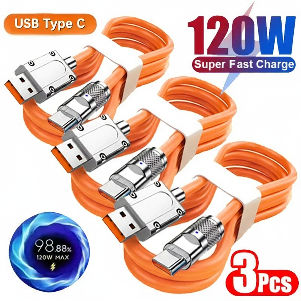 Stay powered wherever life takes you with this 3-pack of 120W USB-C fast charging cables — built for modern devices and busy routines. With high-speed power delivery and smooth liquid-silicone insulation, these cables offer fast, consistent charging without tangles or wear-and-tear. Perfect for daily travel, office desks, home charging hubs and device-heavy households.