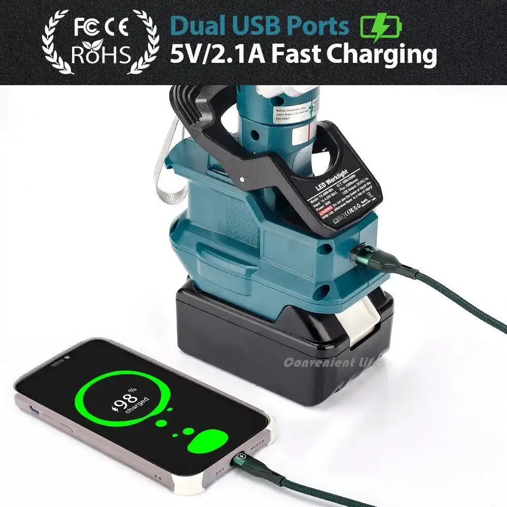 Light up any workspace with this super bright 4200LM LED work light, designed for maximum versatility and durability. Compatible with all Makita 14.4V–20V LXT Lithium-Ion batteries (battery not included), it’s perfect for workshops, car repairs, camping, or emergency situations. Featuring three adjustable lighting modes, a 110° up/down and 300° rotation pivoting head, and a built-in USB 5V/2.1A port, it can double as a power source for your devices. The convenient clip design allows hands-free operation, making it ideal for tight spaces or overhead lighting.