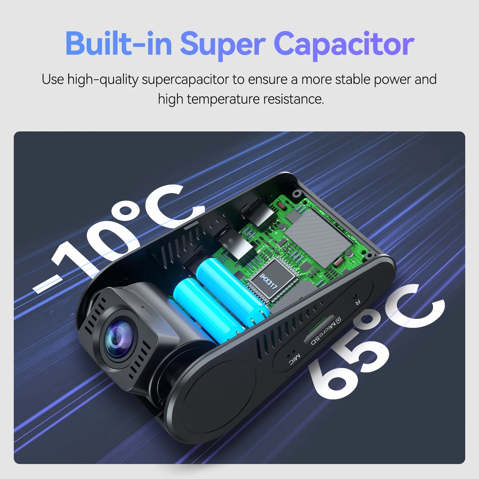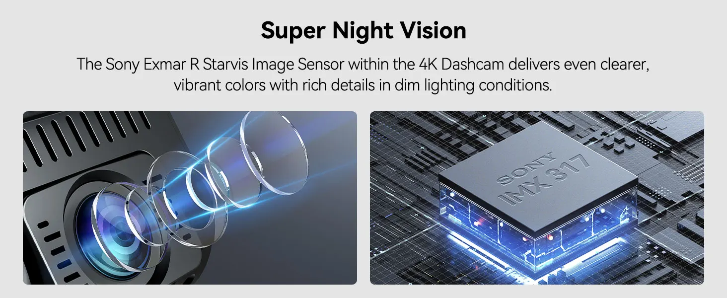 xSecure your vehicle with professional-grade Ultra HD 4K surveillance. The dual-channel system features a high-performance 8MP Sony sensor on the front camera, capturing incredibly sharp 4K footage that makes reading license plates and street signs effortless. Paired with a Full HD rear camera, this setup provides comprehensive coverage of the road ahead and behind, ensuring you have clear evidence of every detail during your journey.