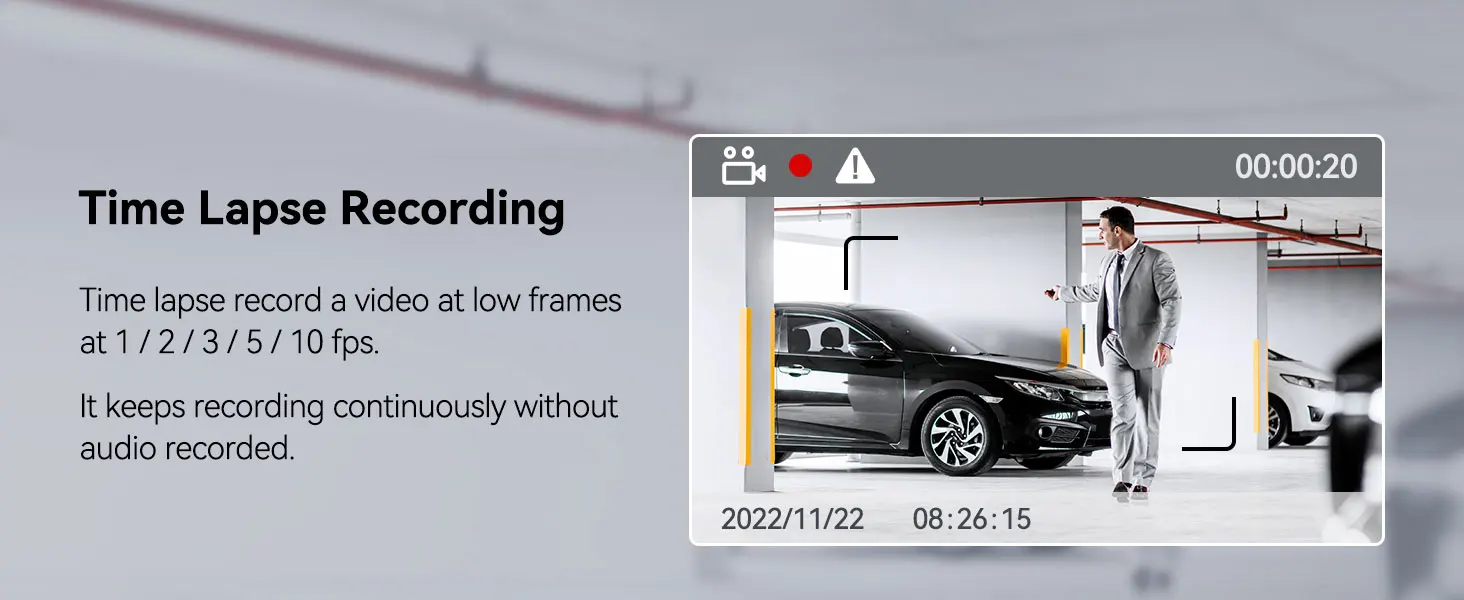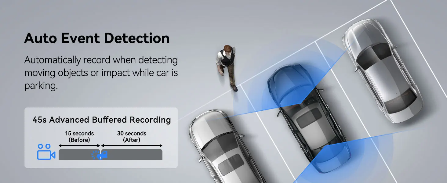 Advanced Buffered Parking: Records 15 seconds before an impact and 30 seconds after, ensuring the full context of an event is captured.