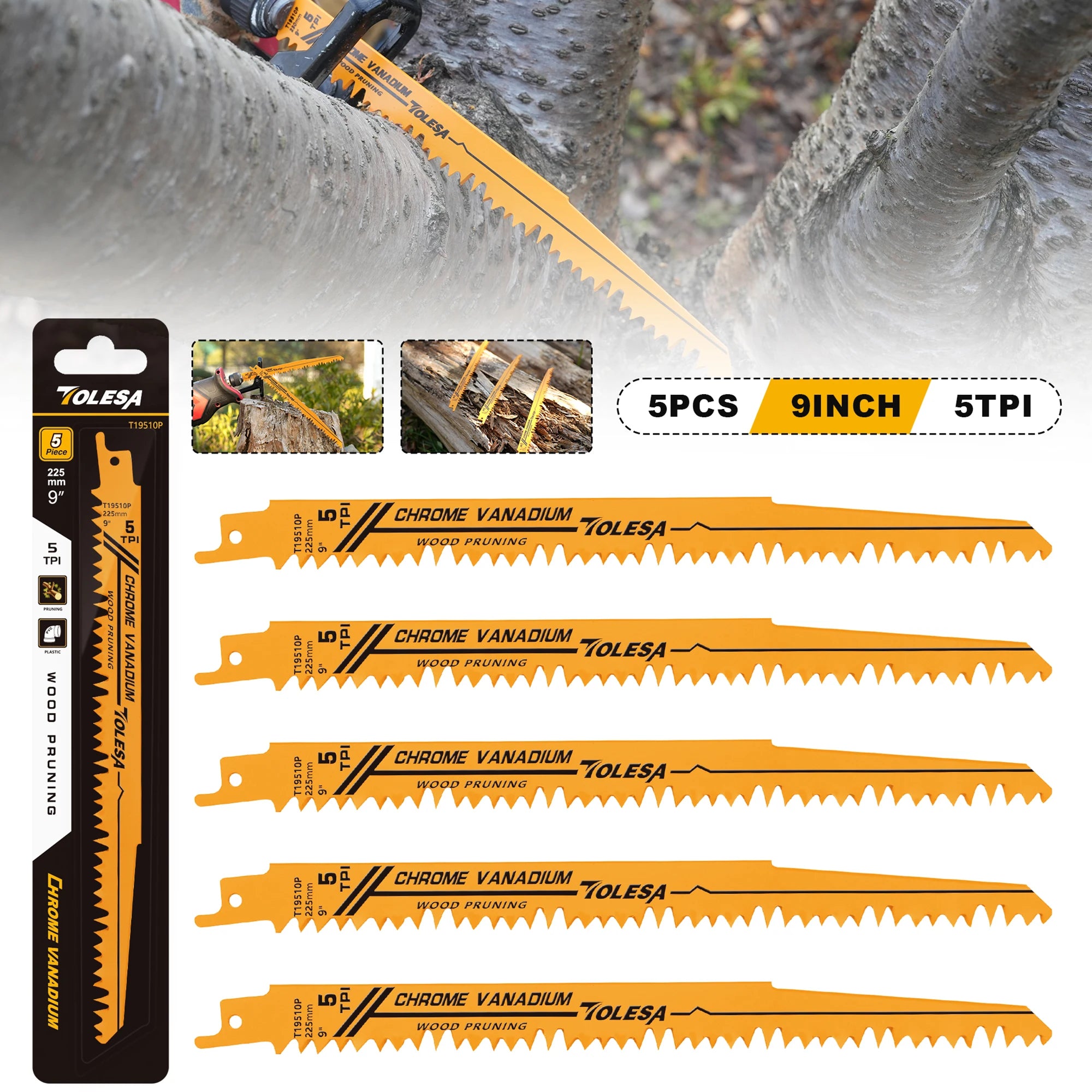 Use these blades for pruning and woodworking tasks where clean, precise cuts are needed. The 5TPI teeth excel on green wood and soft plastics, making them perfect for pruning tree limbs or PVC pipe cuts.