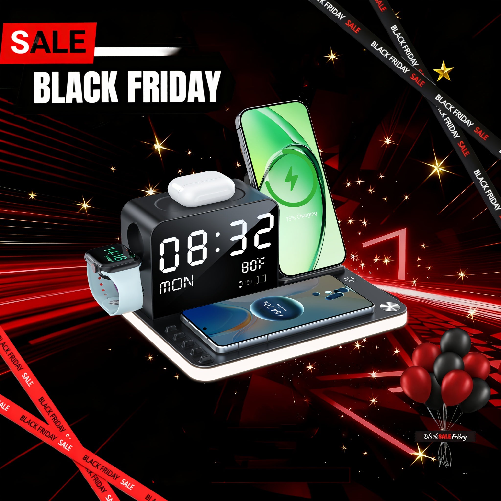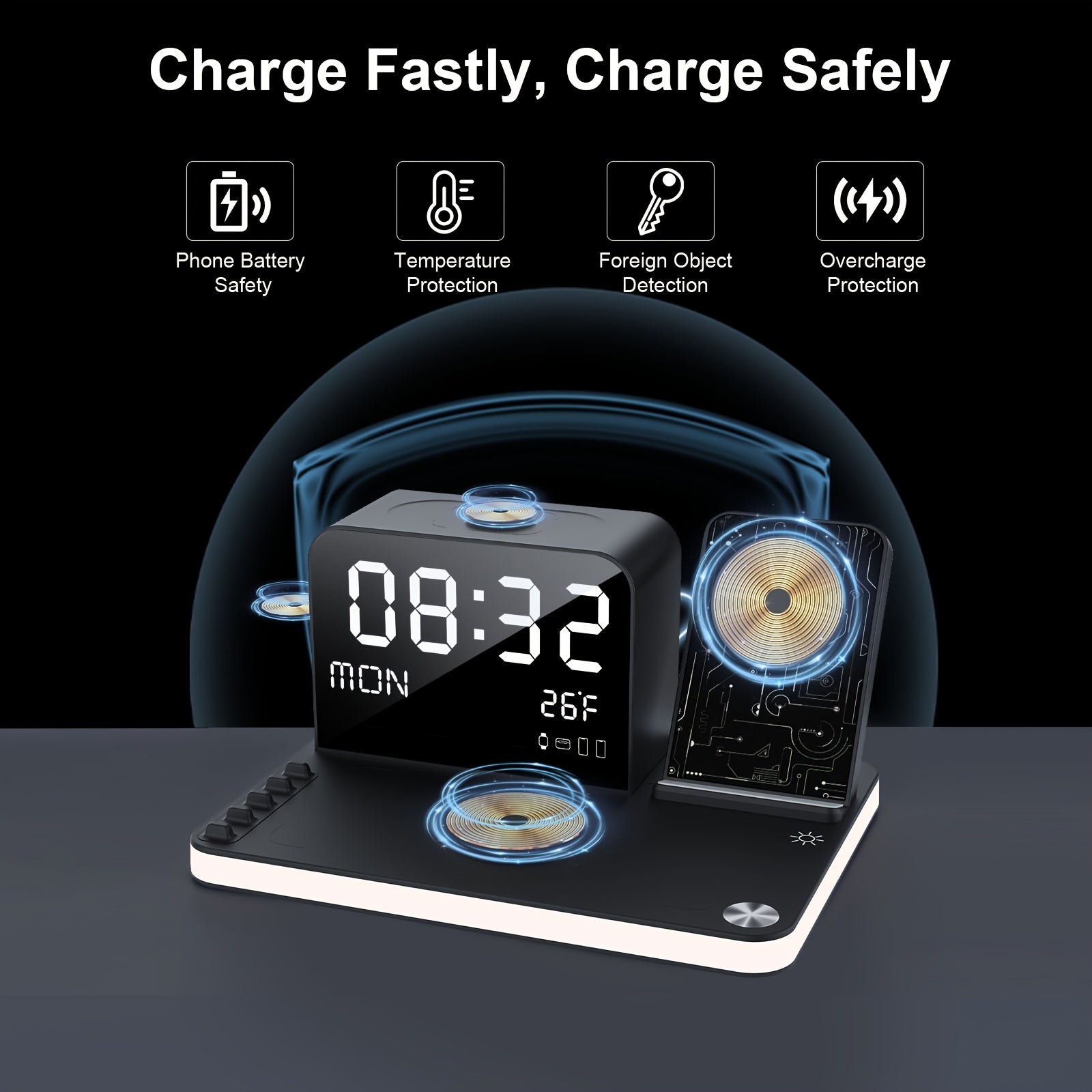 Transform your bedside table, office desk, or living space with one smart charging hub. This 7-in-1 Wireless Charging Station powers all your Apple essentials at once—two phones, Apple Watch, and AirPods—while also offering extra wired USB-C & USB-A ports for additional devices. The large LED screen displays time, day of the week, and indoor temperature, and includes a soft night-light mode for evening use.