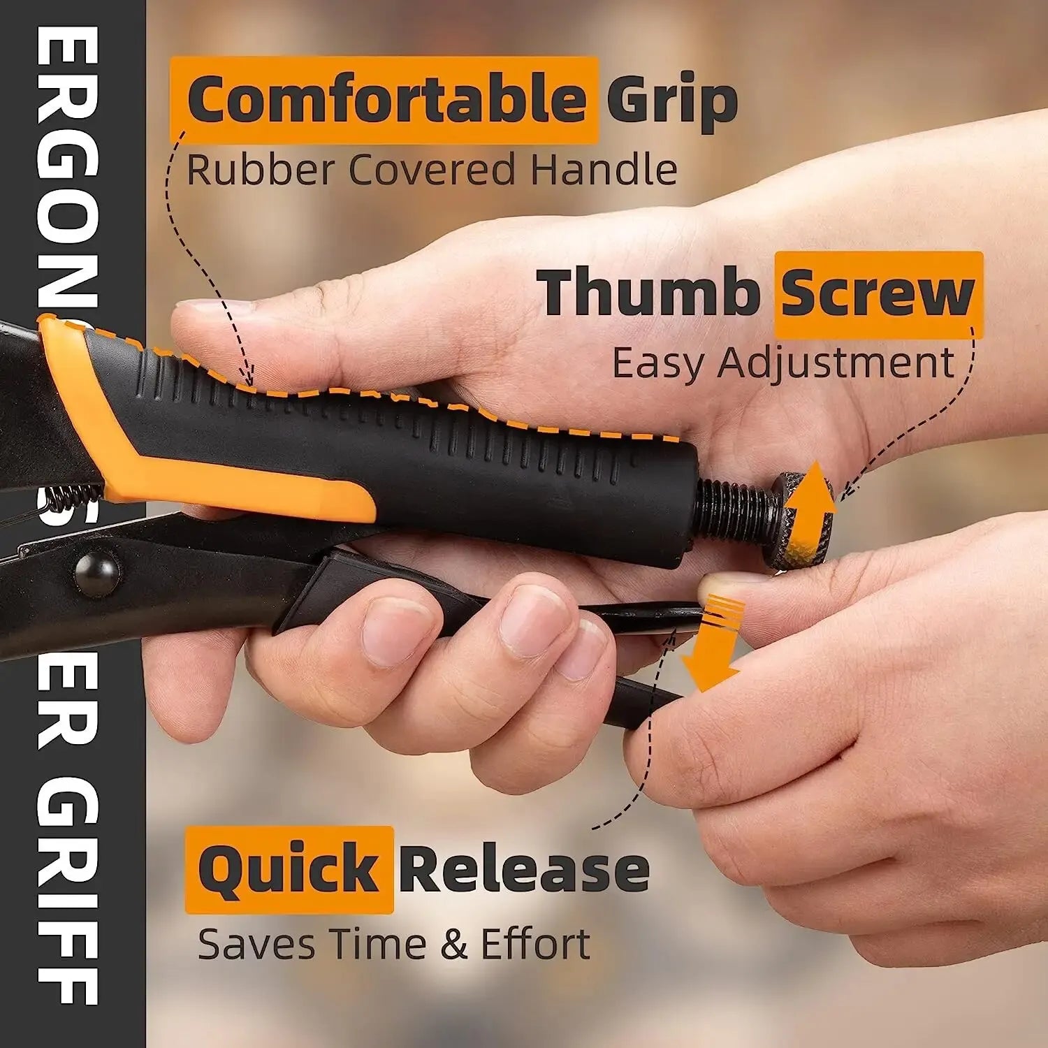Adjust the thumb screw to set the jaw opening, squeeze the ergonomic handle to lock the workpiece, and release with the quick lever. Ideal for holding wood, metal, and other materials flush and secure during assembly.