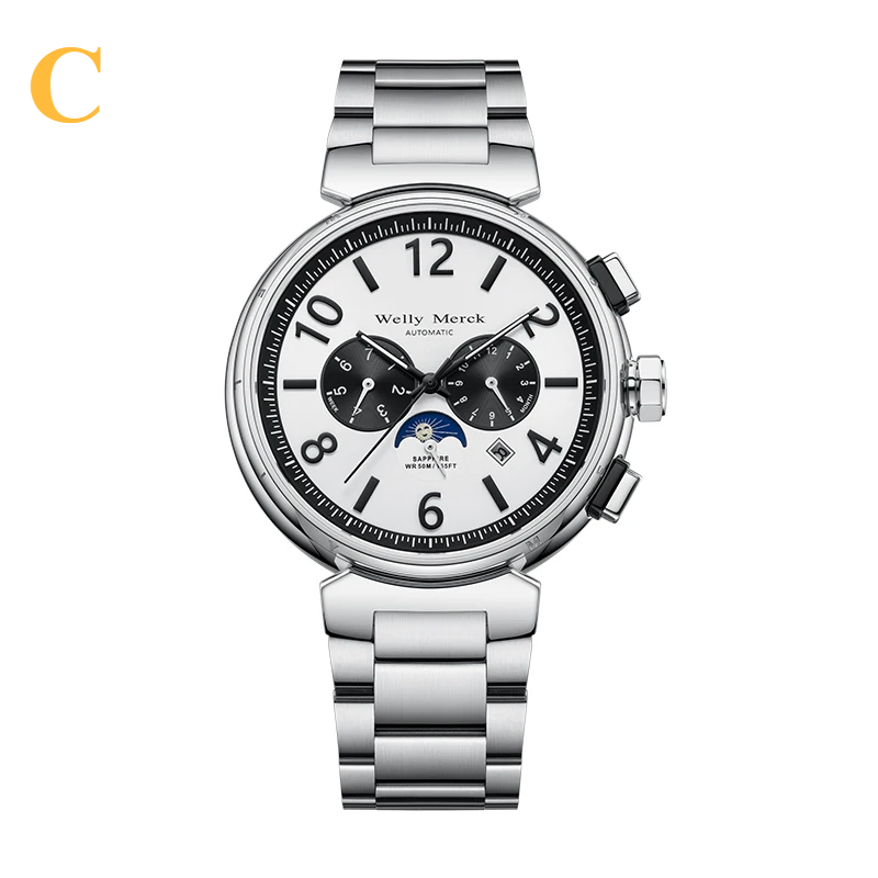 A sophisticated automatic wristwatch built for men who value precision and style. Powered by self-winding mechanical movement, this timepiece never needs a battery — your natural wrist motion keeps it running. Complete with moon phase tracking, week display, luminous hands and markers, and a sapphire crystal, it delivers luxury performance in both business and weekend settings.