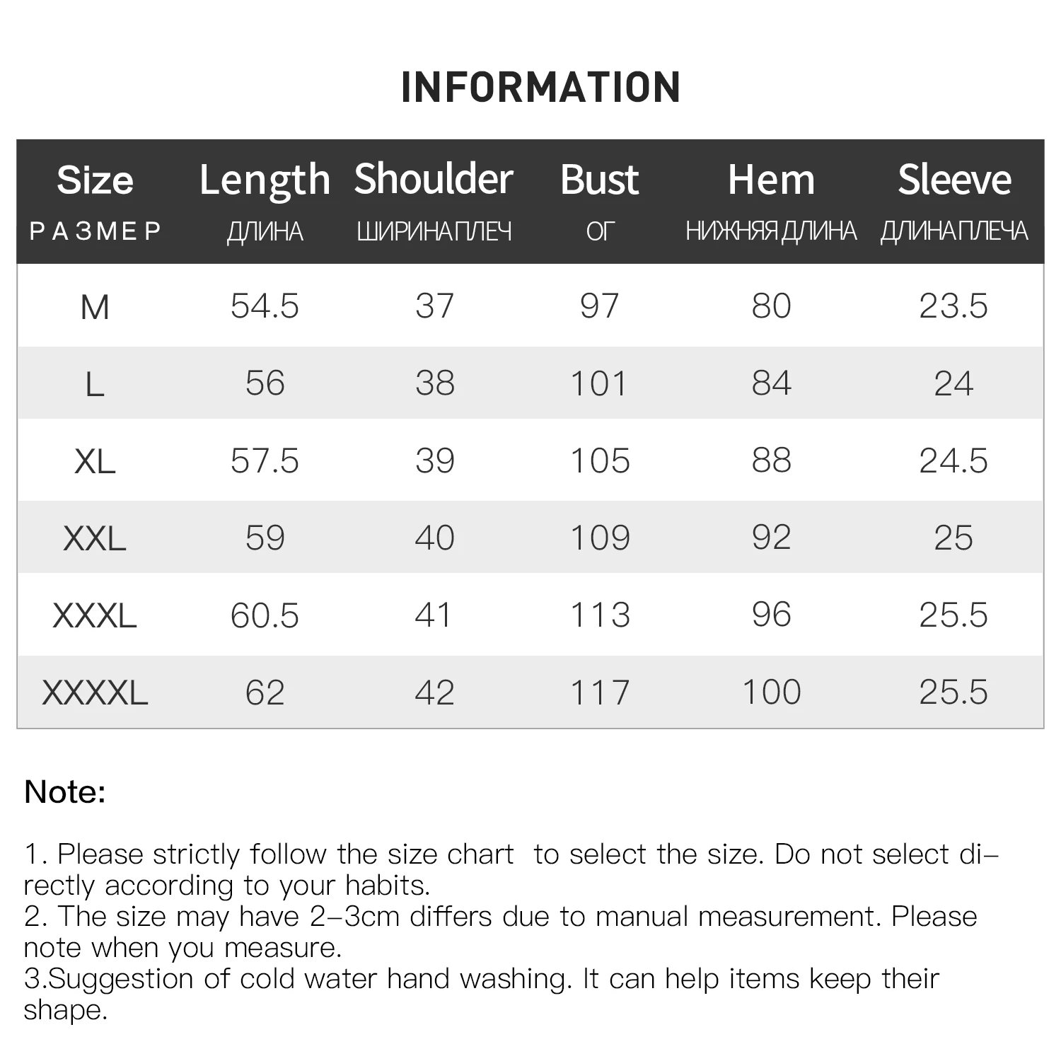 Please allow 1–3 cm variance due to manual measurement. For a slightly relaxed fit, choose your usual size.