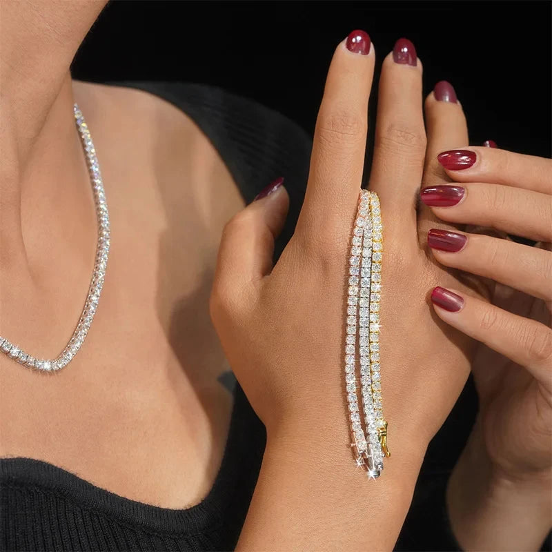 Pair this bracelet with a matching D-color VVS1 Moissanite necklace or stud earrings to create a light-reflective set that dazzles under daylight, restaurant lighting, and flash photography — perfect for events and photos.