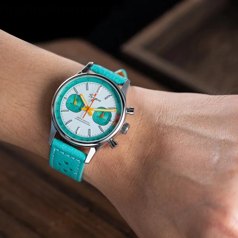 • ST19 Swanneck hand-wound chronograph movement — no battery required