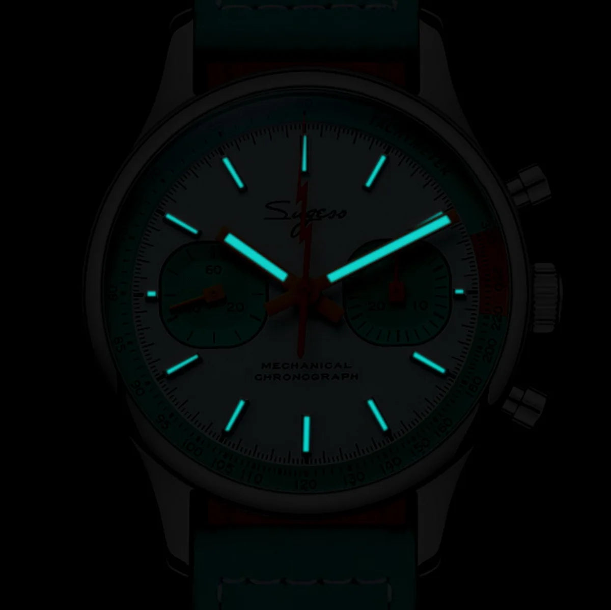 A statement timepiece for men who appreciate heritage watchmaking. Powered by a hand-wound mechanical chronograph movement, this watch delivers precision, racing-inspired performance, and a vintage pilot aesthetic. Finished with a sapphire crystal dial window and a cowhide leather strap, it's built for collectors, professionals, and everyday style.